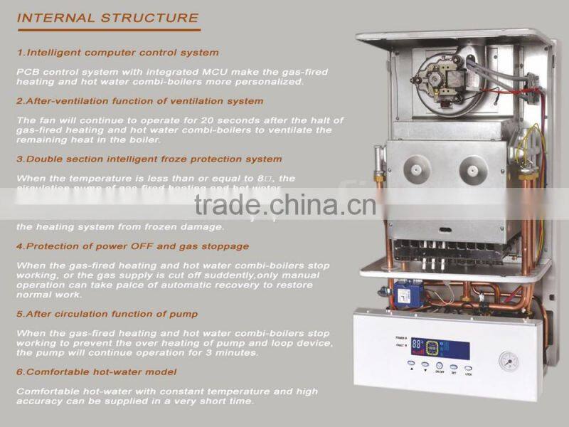 - Five heating modes of energy saving options(Winter heating mode, Daily timed heating mode, Weekly timed heating mode, Economic heating mode and Summer hot water mode).