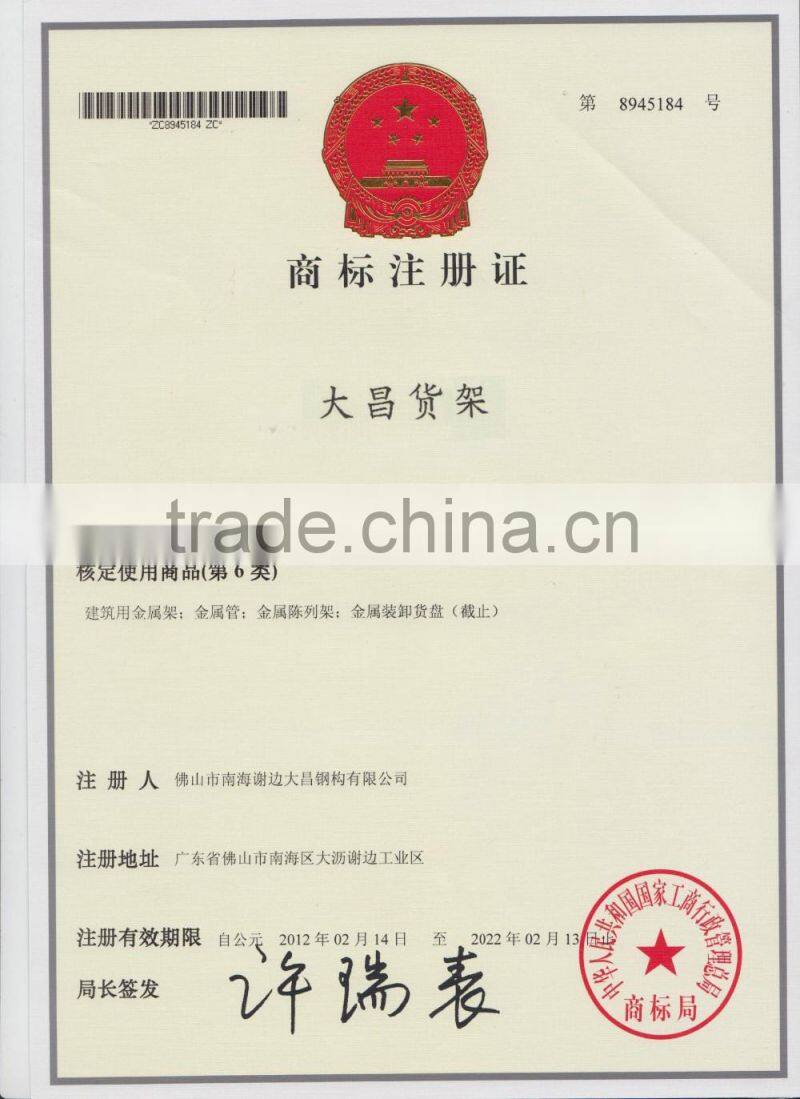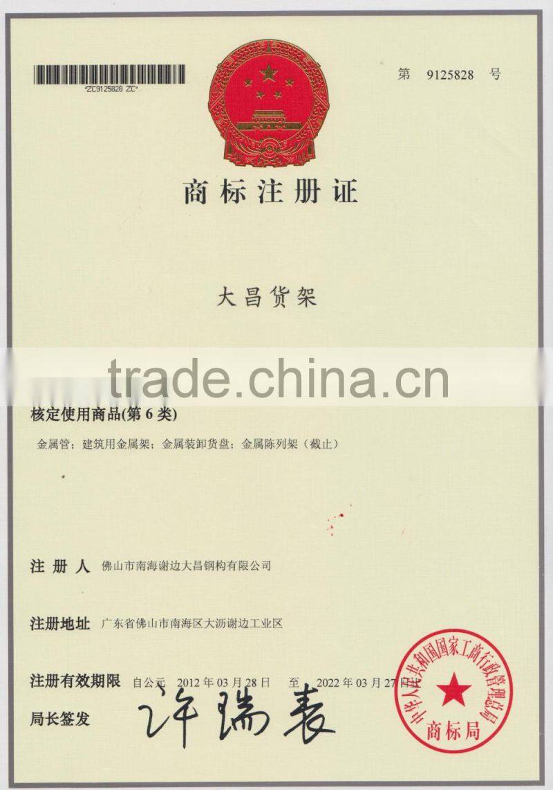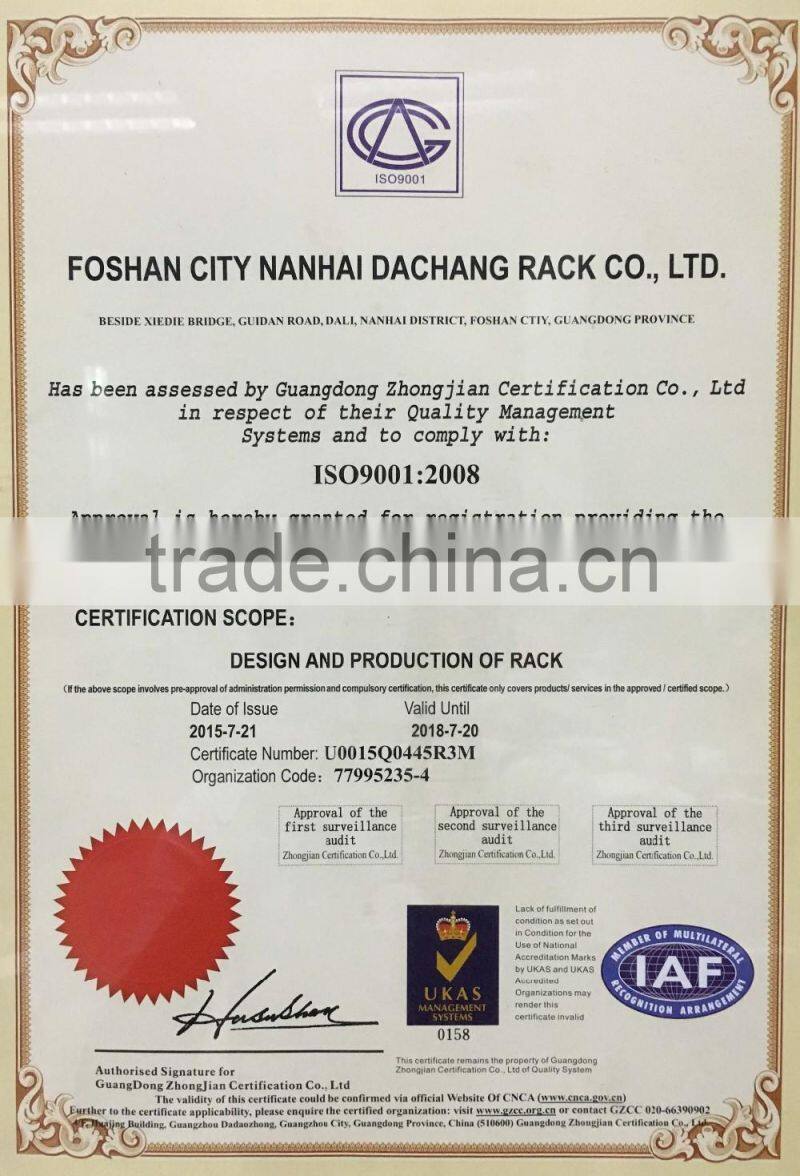 DACHANG Racking & Shelving Co.,Ltd.,established in 1987,with the area of 10.000 square meters,located in Foshan City,Guangdong Province,specializing in designing,manufacturing and selling industrial & commercail shelving and racking products.After 30 years development,Dachang has became a famous factory of high tech equipped workshop,with a group of senior engineers,professional designers.Our products are selling well at home and abroad,and our One - stop services have earned wide market recognition.