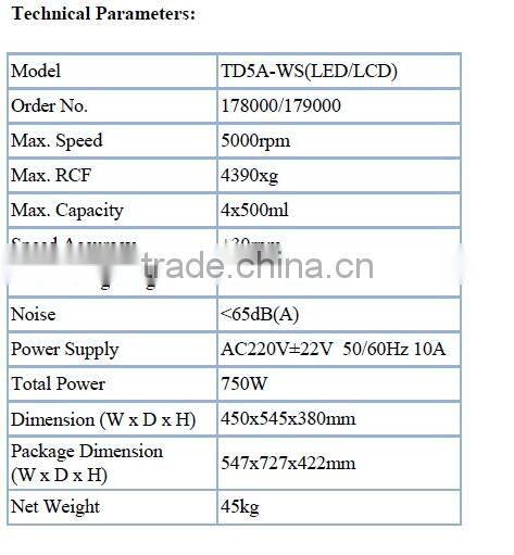TD5A-WS Tabletop Low Speed Large Capacity Centrifuge, which max capacity is 4*500ml, various buckets and adaptors are available. It is the best choice for the hospitals ,blood banks and disease control center.