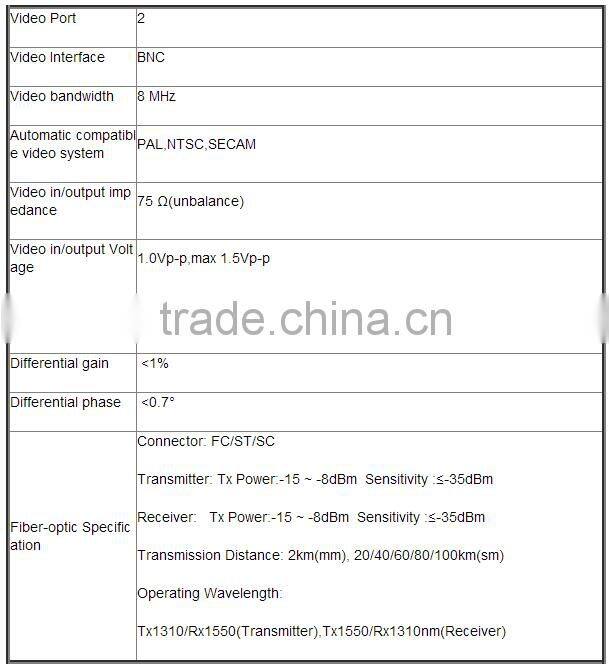 2 Channel Vide fiber optical video transmitter and receive can simultaneously transmit 2 channel of 8 bit digitally encoded broadcast quality video / reverse or bidirectional data / unidirectional or bidirectional audio / Ethernet / Telephone / Dry contact over one single mode or multimode optical fiber. These multiplexers are typically used in applications where the cameras have PTZ capabilities. Plug and Play design ensures the ease of installation and operation. Electronic and optical adjustments are never required. LED indicators are provided for instantly monitoring system status. Devices are available for either standalone or rack-mount installation ,which is suitable for different working environment.