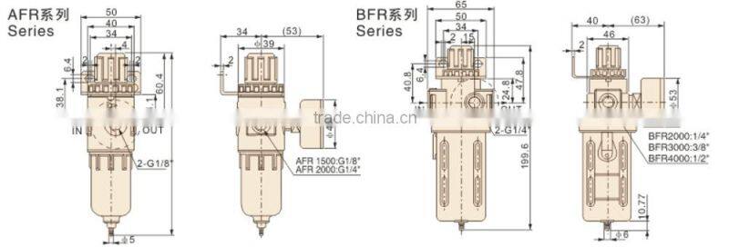 Filter and regulator together as one part, make it has compact dimension. Filter adopts novel vane design with high division efficiency and differential pressure discharge device. It can discharge water automatically. Regulator valve adopts balanced inlet structure with the advantages of stable pressure, high precision, and quick reaction.