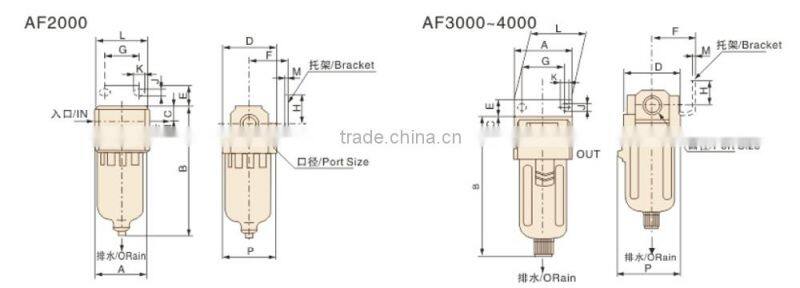 AF series air filter is same as & nice replacement for SMC type. It has standard dimensions and steady performance. High quality filter elements supply clear air for valve and cylinder. Auto Drain can be selected.
