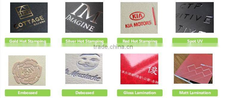 * Surface Finishing: Matte/gloss lamination, vanishing, Gold/Silver hot stamping, debossed, embossing, Spot UV, etc