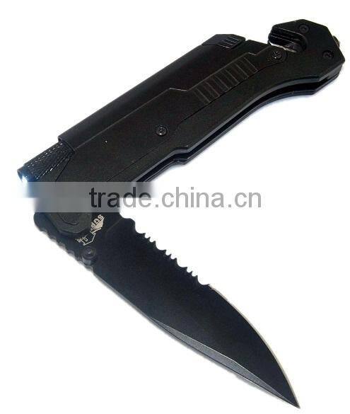 Built for extreme adventures, this knife is crafted using Grade 420 stainless steel for maximum durability. A liner lock system ensures the blade is secure when in use, and a pull-lock keeps the blade safely stored in the handle to prevent from accidental unsheathing, requiring two hands to open the blade. Use the serrated edge to cut with speed or the straight edge to cut with precision. The built-in LED light lets you see in the dark while the magnesium alloy (flint) fire starter lets you start your own campfire. If you find yourself trapped inside your own vehicle, use the belt cutter and window breaker for a quick escape.