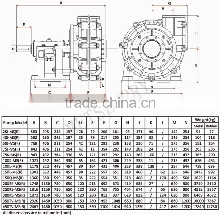 M, AH(R), HH pumps are used to pump high-hardness, strong-corrosion and high-concentration liquids that contain suspended solid particles, such as finished ores, refuse ores, ashes, cinders, cements, mud, mineral stones, lime and etc. in the industries of metallurgy, mining, coal, power, building material and etc.