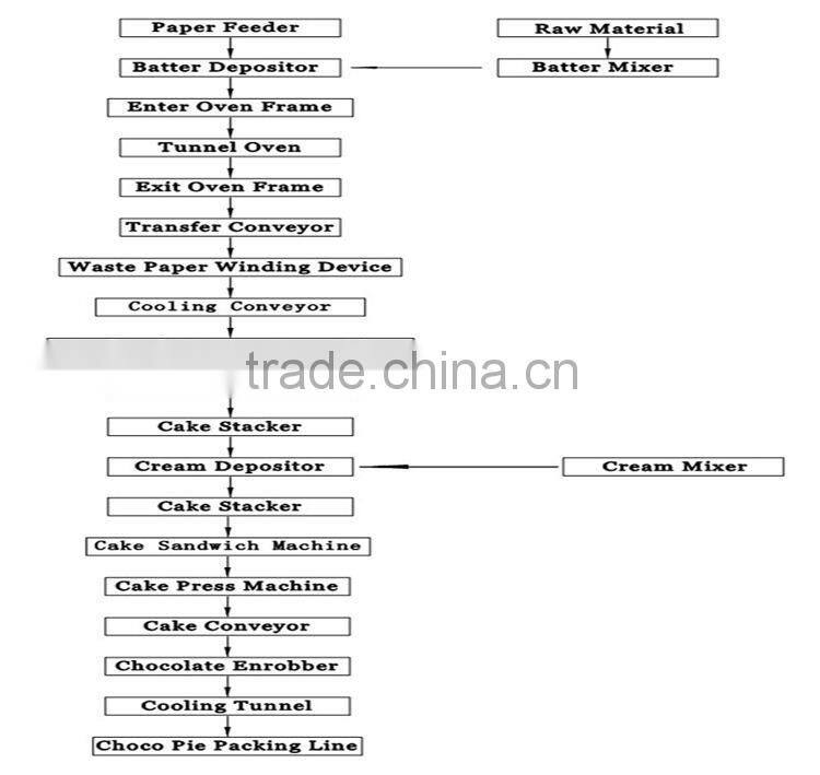 Guaqiao Brand choco pie production line is developed on the basic of advanced foreign technology, After decades of manufacturing & development , Now all the machines have been improved in our rich experience of practical production. It is also designed according to the feedbacks from domestic and overseas customers. Low cost, low energy-exhausting, small dimension, high profit, and easy-repairing are its best features. It is composed of Batter Mixer, Paper Feeder, Batter Depositor, Tunnel Oven, Cooling Conveyor, Stacker for Cream Depositing , , Stacker for Sandwiching, Sandwich Machine, Products Conveyor and other assistant machines.