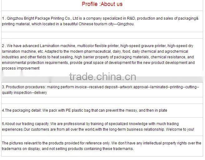 Product have Environmental protecting, good printing, good light-proof, high-barrier, easy -use and flatness.