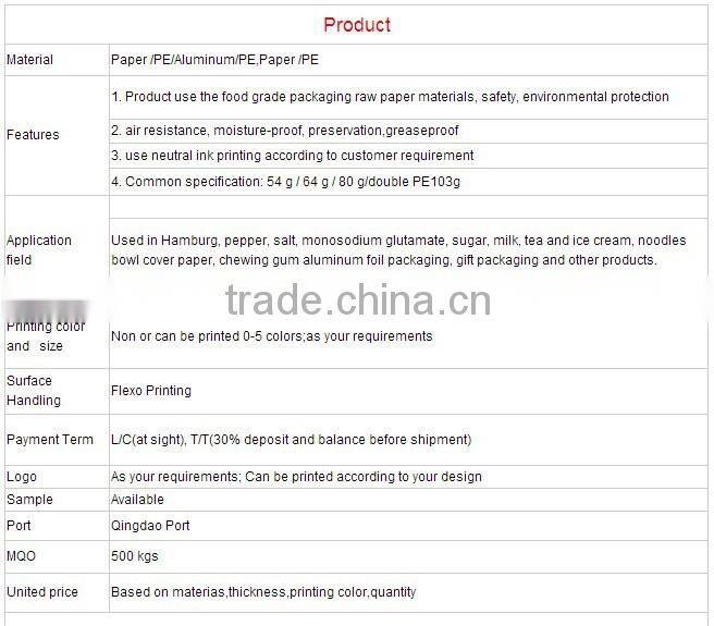 1.Our PE Laminated Paper is mainly used for hamburgers, sugar, salt, pepper, cream, milk, tea,