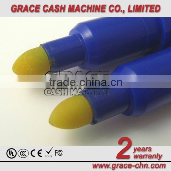 As the paper that banknotes are made of typically consists of starch, linen and other fabrics, the percentage of iodine in the pen can affect the quality of the note checker pens result. Insufficient iodine will render the banknote detector pen useless. Cheap banknote detector pens from an unusual source may often be made cheaply just to get the sale and will be a poor banknote detector. High-quality banknote detector pens from Grace Cash Machine Co., Limited always have the ideal solution inside them to act as an accurate banknote detector.