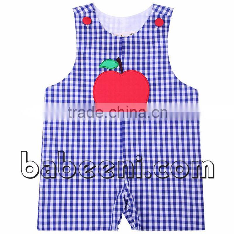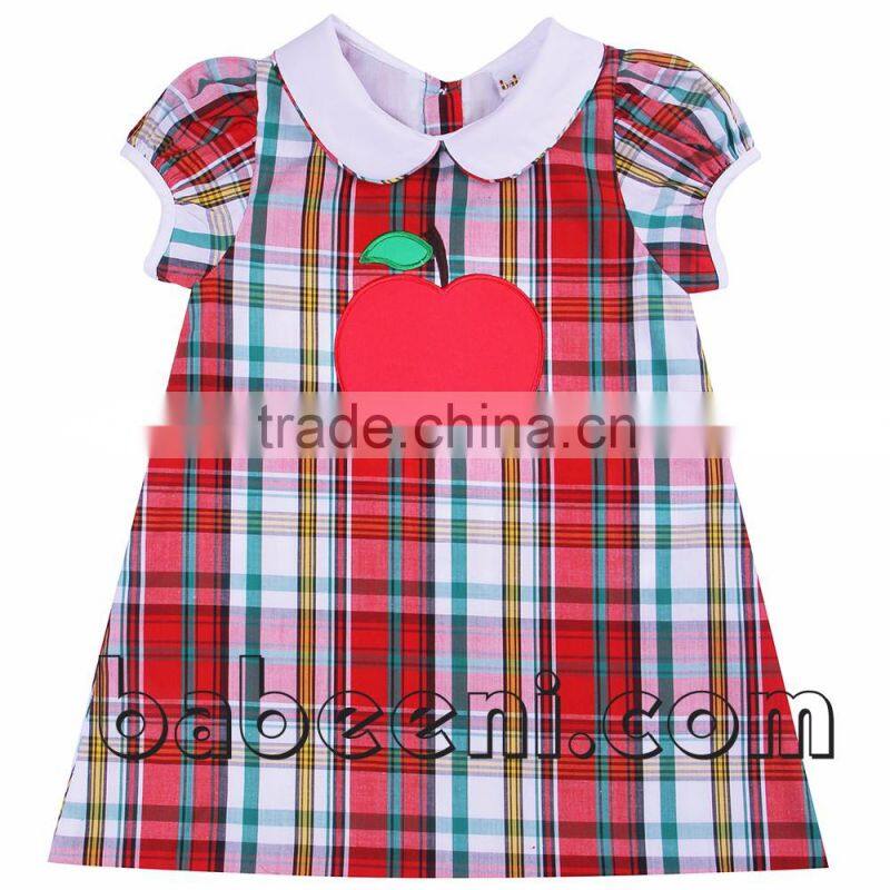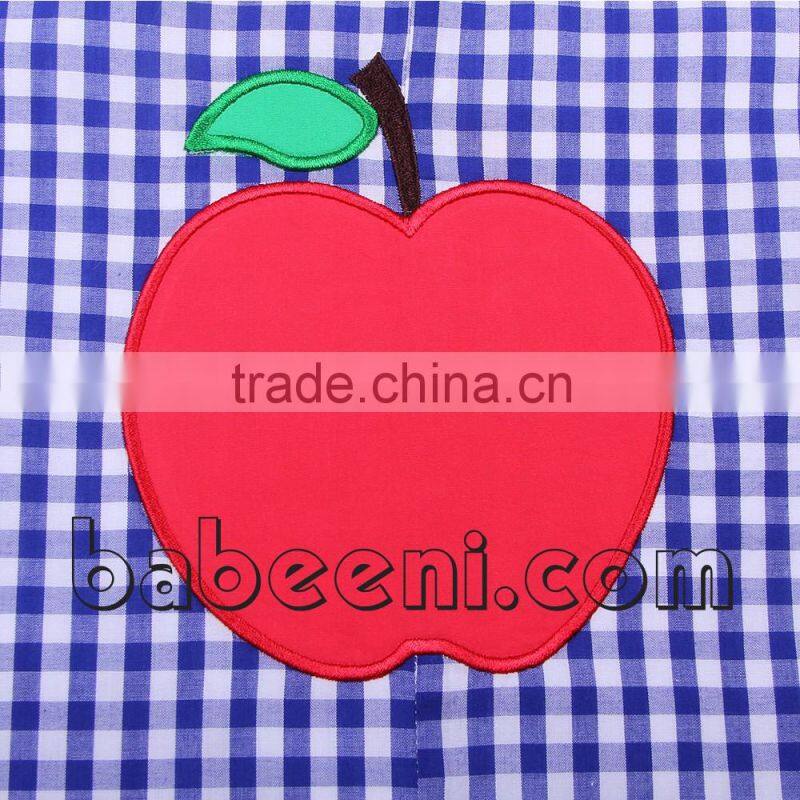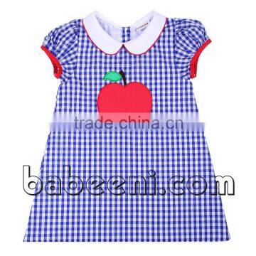 Navy large gingham applique A-line dress for back to school with red apple appliqued pattern on the chest, short sleeves, back buttons.