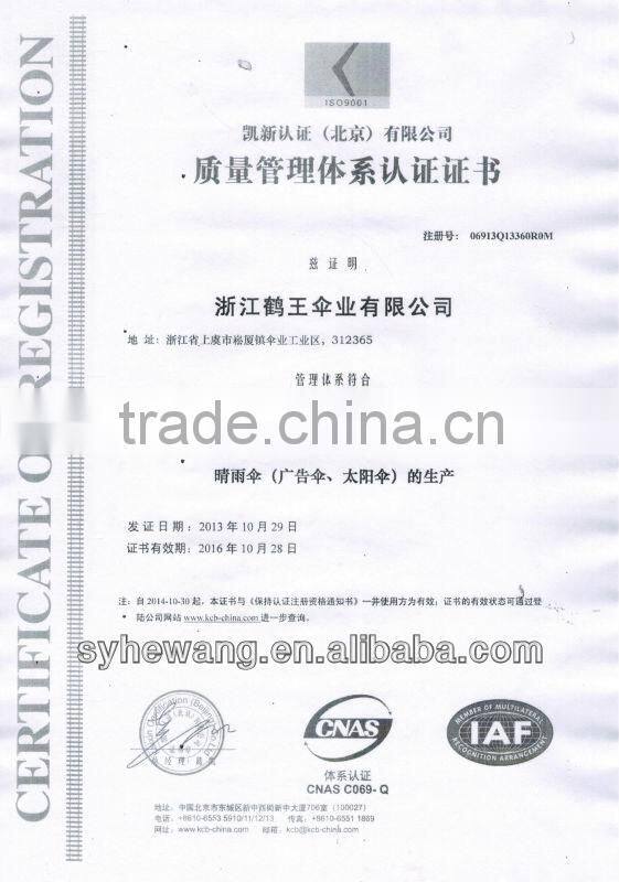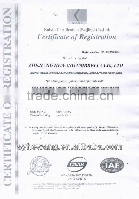 Hewang is a professinal umbrella maufacturer, and specially in this line about 12 years. our capacity is 5000pcs per day.We can offer all kinds of umbrella as your need. Beach Umbrella,Advertising Umbrella,Garden Umbrella,Golf umbrella,Promotion Umbrella,Gift Umbrella etc. if you want to know more about our company or interested in our company,pls directly contact us on line or by mail,we will reply you soon.