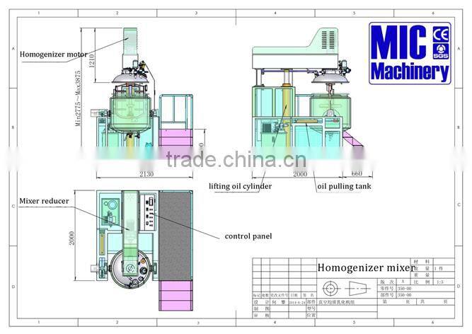 This machine is composed of oil tank, water tank, vacuum homogeneous emulsifying machine, heating system, mixing system, vacuum system, hydraulic lift system, operation control cabinet, piping system components, is the most applicable cream equipment production of high-grade skin care products or products.