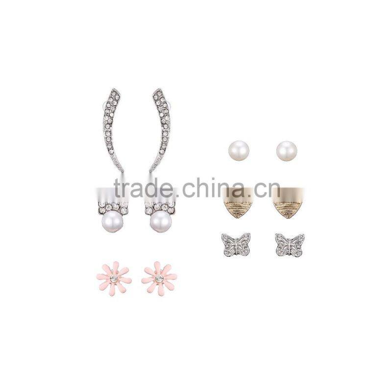 Enamel Flower Rhinestone Horn Brushed Gold Heart Silver Butterfly Pearl Lucky Bow Stud Earrings Set for Lovely Girl