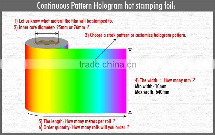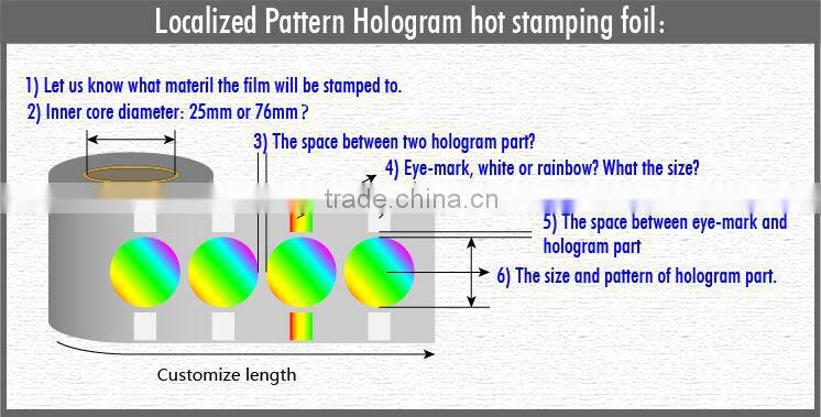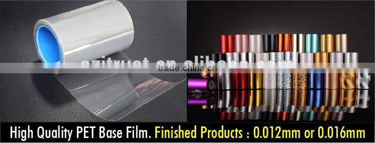 Our Products of hot stamping foil use of PET material, thickness is 0.012mm or 0.016mm.