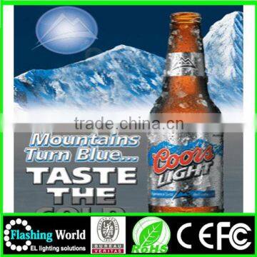 Turn your high-resolution posters, logos, and banners into dazzling animated EL sheets. EL technology produces highly flexible, thin, lightweight dynamic lighted signs. Depending on their size, these signs can be powered by regular plug-in outlets or battery pack.