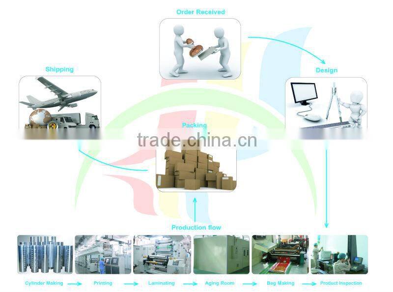 Feature | 1.Food bags for coffee,tea,chocolate,candy,seafood,noodles,rice,snack.frozen food, fast food,etc. 2.Pet bags include pet food bags and pet cleaning bags for pets such as dogs,cats,birds,fish,etc. 3.Commodity bags for commodities such as washing powder,cosmetics,toilet paper,diaper.etc. 4.Special bags for food storage,seeds packaging and so on. 5.Available bag style:stand up,zippered,heat sealed,heat-cut,cold-cut,with handle or valve,etc. 6.These bags are no harm to health,high temperature resistant, corrosion resistant and anti-aging. 7.We can print any color on the bag with our advanced machine. 8.The design,size,color,etc.according to the customers. 9.Our products used for packaging food,tea,coffee,spices,sauces,meat,frozen 10.Food,pets’food,seafood,juice,snack food,nearly including all kinds of food and the detergent. | ||