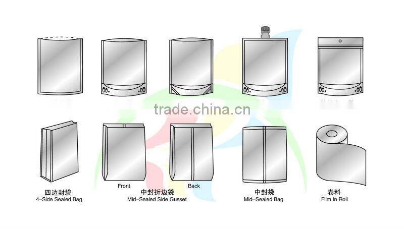 Bag style: | Three sides sealed, Aluminum Foil, Side/Bottom Gusset, Stand up (zipper&spout). | ||