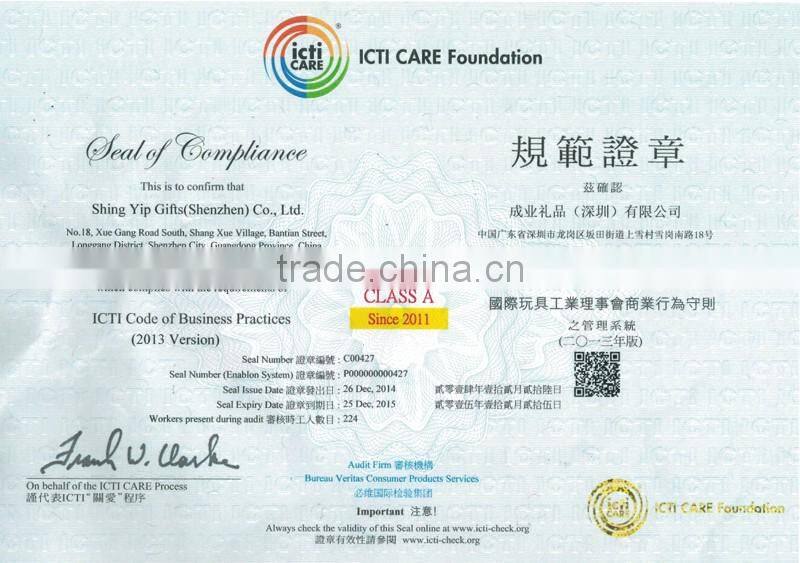 Our mission inbusiness is: quality and customers’ satisfaction guaranteed.Though decades of all stuff’s endeavor, we have won customers’ trust onquality, price, service and other aspects. We have got certificates like ICTI,Disney report,ISO9000 and CCC.