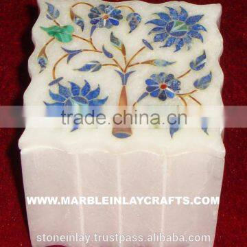 This is a Marble Inlay Box. It is made from semi precious stone and precious stones inlaid work is also done on it. It can be used for Jewellery Box, Decorative Box. All the work is done by hand. You can find many designs and colours in inlay works. We are one of the reputed & trusted organizations, engaged in manufacturing and supplying Marble Inlay Boxes in the market. Our team of experienced and assiduous professionals, design these as per the latest fashion trends. These are widely acknowledged by our valued customers all over the nation for their aesthetic appeal, flawless finish and intricate designs..