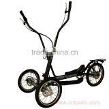 The elliptical bike consists of a Tshaped lower frame to which two front wheels and a rear wheel containing a drive