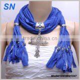 6. Stay on trend with the jewelry scarf. It combines the two ever so stylish accessories of scarves and jewelry