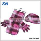 Winter Fashion Checked Polar Fleece Scarf Gloves Beanie Set