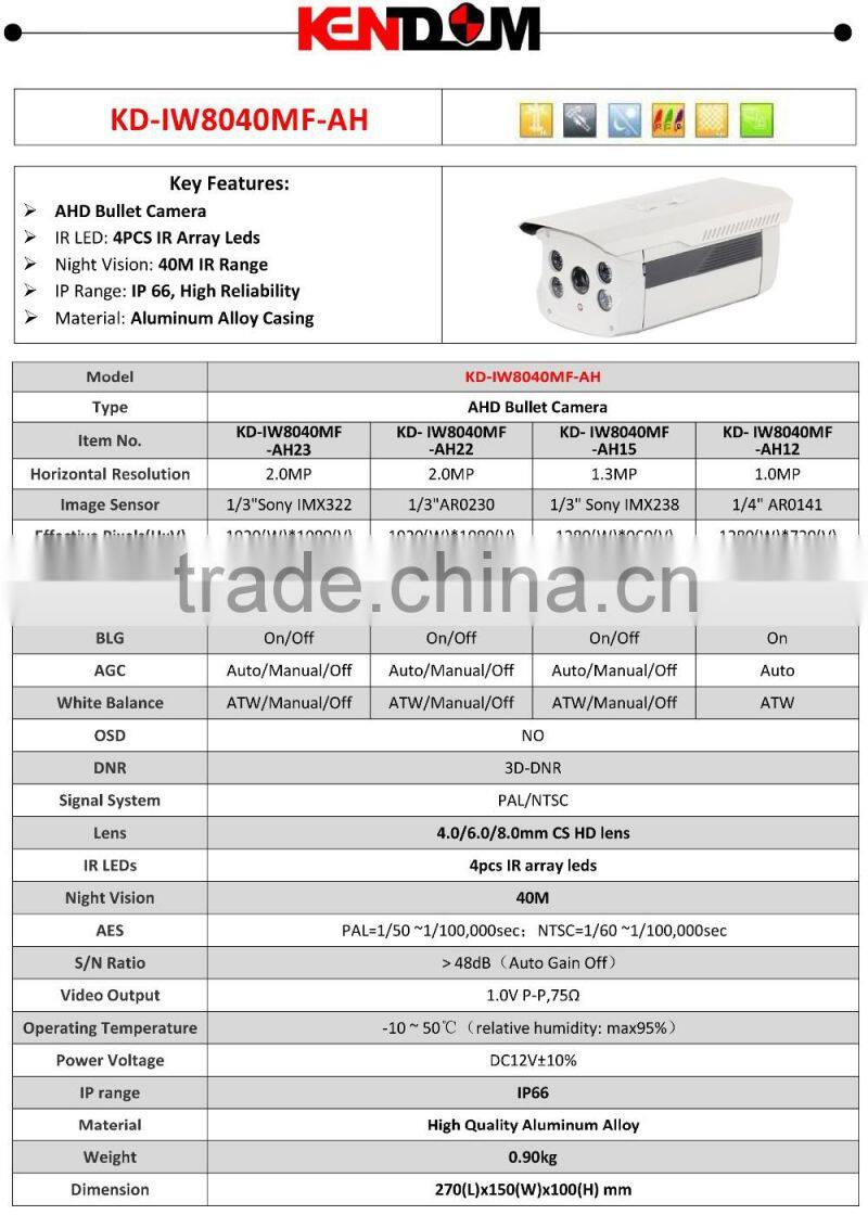 Kendom KD-IW8040MF-AH15 High Quality 1.3 MP AHD Camera Infrared Full HD Waterproof Bullet CCTV Security with 4pcs IR Array Leds