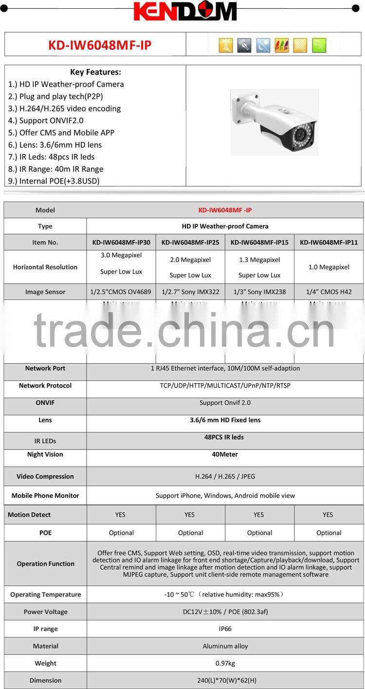 Kendom KD-IW7136MF-IP30 2016 CE ROHS FCC Passed 3.0MP P2P Onvif HD Plug and Play IP Camera Ourdoor Bullet Security Network