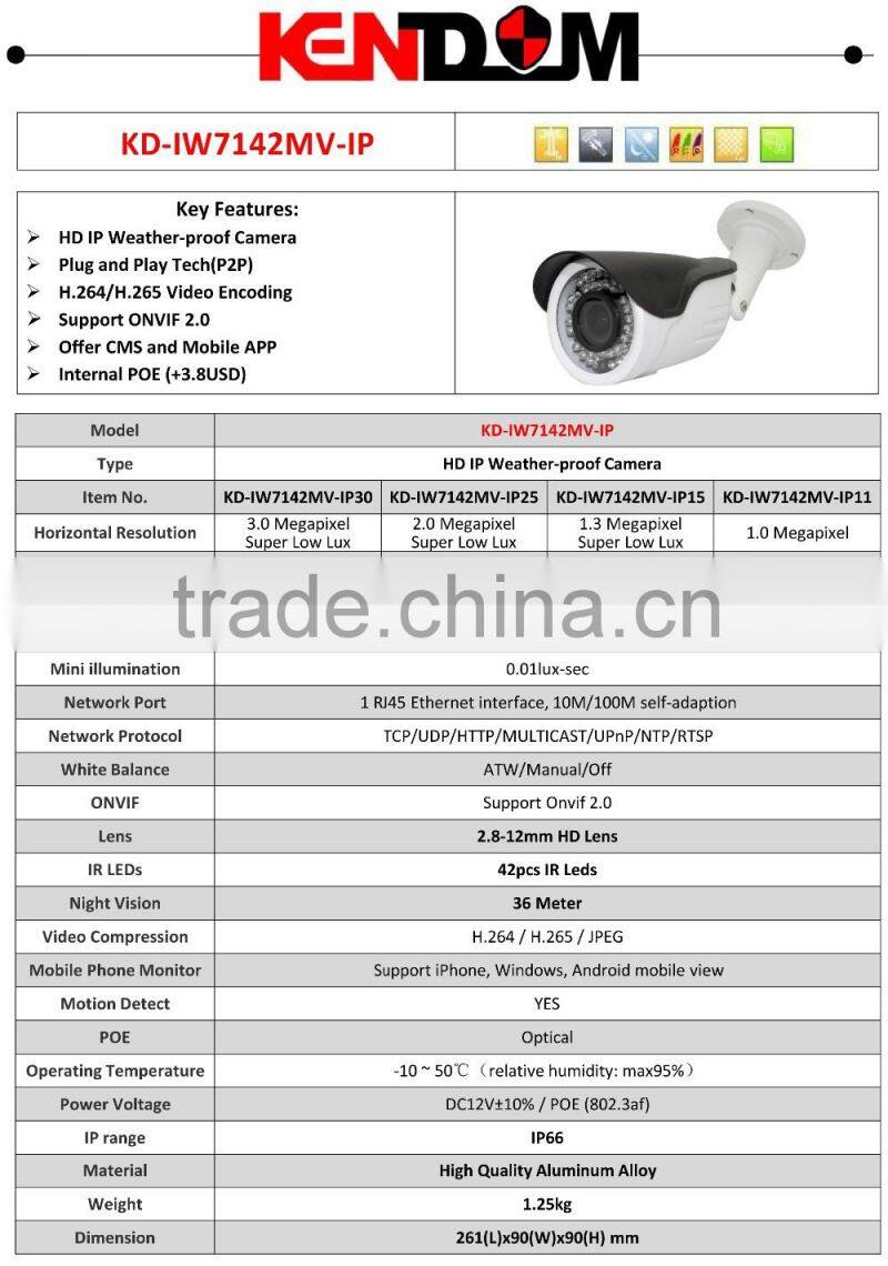 Kendom KD-IW7142MV-IP30 1080P 3.0MP IP Camera with IR-CUT Filter Security Onvif P2P Waterproof Surveillance System with Varifocal Lens
