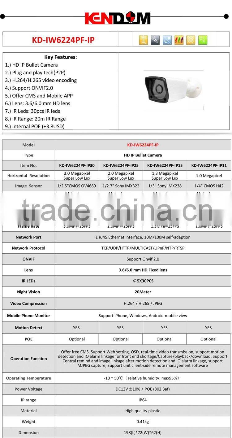 Kendom New Small size Bullet IP Camera High-end 3 Megapixel Camera CCTV for Outdoor with POE (Power over Ethernet)