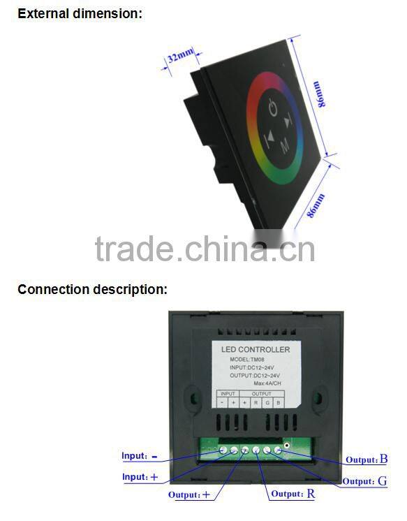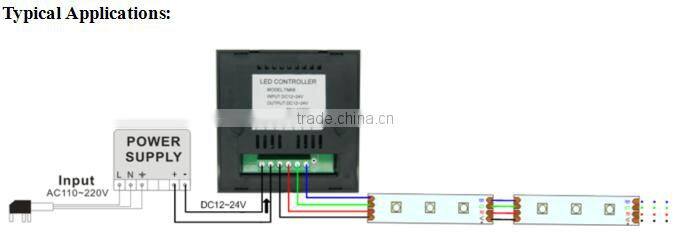 Touch panel controller is a new high-end controller which newly developed by our company. It adopts glass panel design, is beautiful and fashionable in appearance. It adopts high precision capacitance touch control chip, increases the touch sensitivity, reduces trigger which caused by mistake. It is used for controlling a variety of lamp whose source of light is LED. For instance, point source of light,flexible light strip, wall washer lamp, panel lights etc., it has many advantages such as convenient to connect, easy to use and others. According to the actual need of customers,it can carry out jumpy changing,gradual changing, strobo flash and other effects of change.