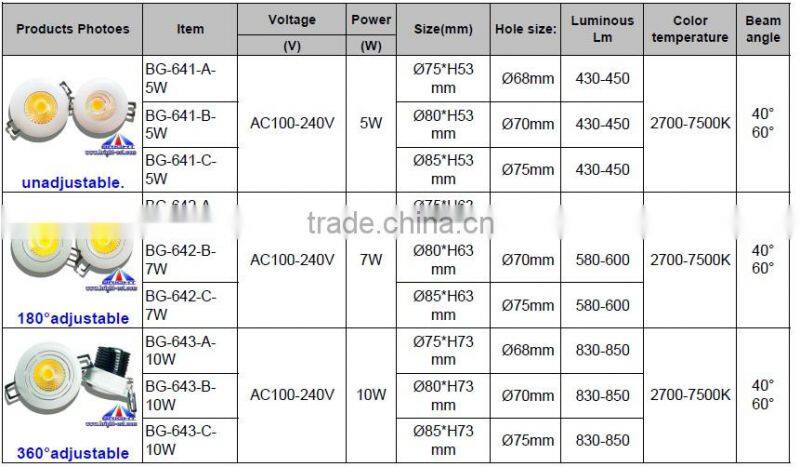 5w 7w 10w Dimmable COB LED Downlight Indoor Lighting,Downlight With White Finishing,68 70 75 Hole Power Dimmable LED Downlight