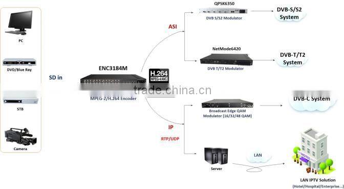 ENC3184M simultaneously encodes video/audio feeds as MPEG-2 SD 4:2:0 and MPEG-4 AVC (H.264) SD 4:2:0,using MPEG-1 Layer-II, LC AAC,HE AAC,AC3 audio ed to address this ever increasing demand for more video and audio services. with efficient bitrate utilization,high reliability and advanced compress arithmetic,it possible to transmit high quality video content at the lowest possible bandwidth. And produce ASI(MPTS Mode) and IP(SPTS/MPTS) output data streams.