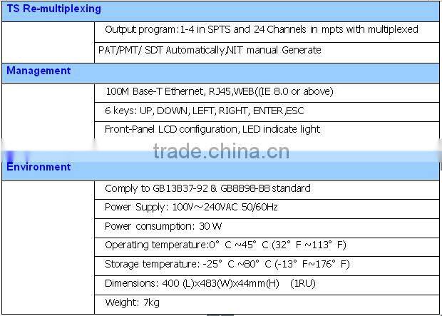 - Single board system output rate range: 2 ~ 60Mbps output bit rate encoding, multiplexing the output rate of 2 ~ 150Mbps.