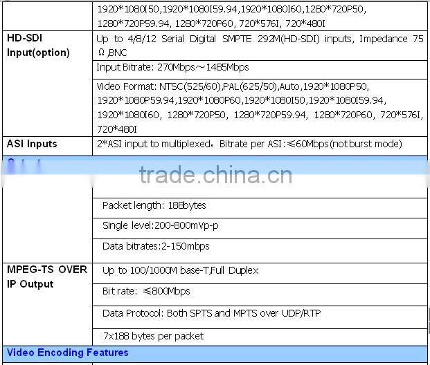 - Optional 4/8/12 Channels encoding ,4 HDMI(HDCP),2seperate ASI Inputs,2 indentical ASI and GbE IP out per Module, 3 Modules per 1RU Chassis
