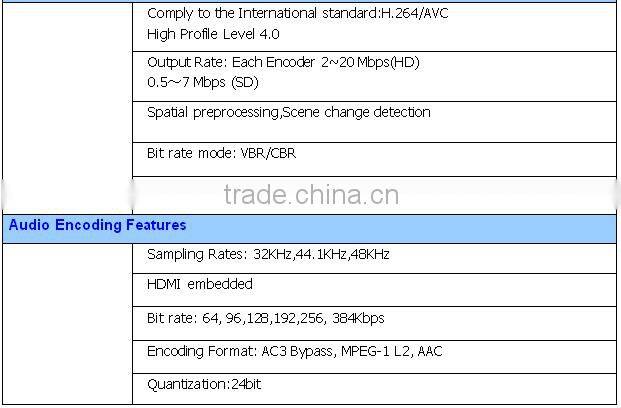 - Audio encoding mode support Bypass MPEG-1,L2,AC3 Bypass,AAC.