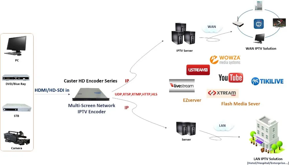 Caster-T315H can push/pull H.264, MPEG-4 encoding video streams deliver to various servers, such as Adobe Flash Server, Wowza Server, Windows Media Server, Apples HTTP Live Streaming, and some other servers base on UDP/RTSP/RTMP/HTTP/RTP protocols.