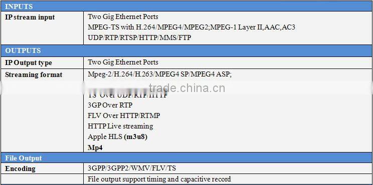 - GbE IP outputs – UDP,RTSP,RTMP,HTTP,HTTP Live Smooth(HLS),FTP