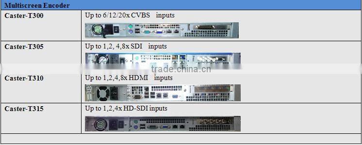 Caster32A runs on powerful hardware, representing the highest density available with the highest performance on a carrier grade 3-RU server platform. Enables to deliver impressive images to various servers, such as Adobe Flash Server, Wowza Server, Windows Media Server, Apples HTTP Live Streaming, and some other servers base on UDP/RTSP/RTMP/HTTP/RTP protocols.