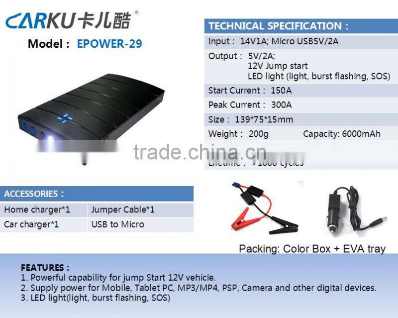 12000mAh Car Jump Starter Carku Epower-21 Peak Current 300A Power Bank for Smartphone ,laptop ,camera