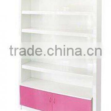Display rack has 2 lights at top;surface of wood is painting;bottom is a storage cabinet