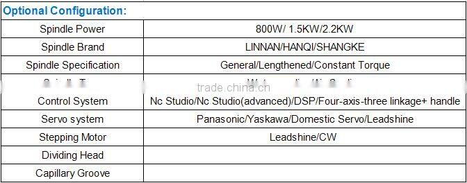 | Spindle | 800W~2.2KW Variable Frequency water-cooling |