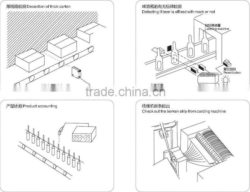 Through-beam bype photoelectric switch is designed that via the light beam between opposite-mounted transmitter and receiver, the object passing through these two devices will interrupt the light beam and start the receiver.