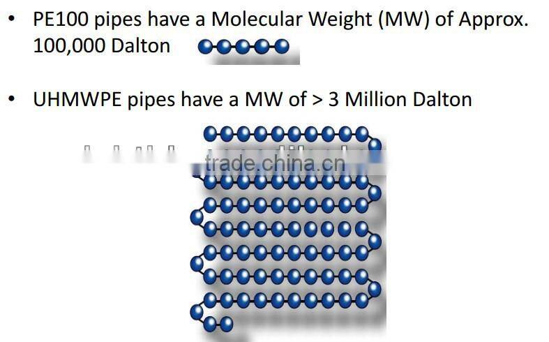 A: the molecular wieght for HDPE pipe is only 30,000-100,000, however, the UHMWPE pipes is 3.5 million to 9.2 million. The higher molecular weight enables UHMWPE pipes to have a much better quality than HDPE pipes.