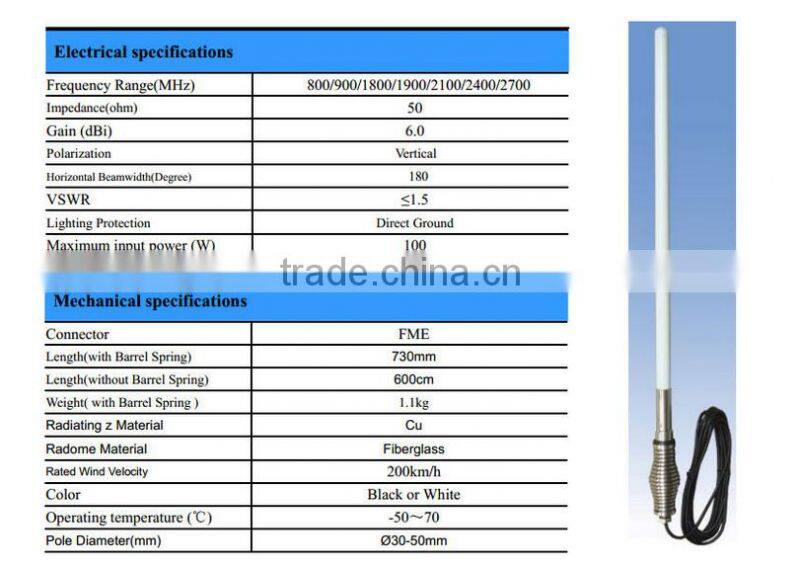 Home > Products > Base Station antenna > High Performance Multi-band Omni-directional Barrel Spring Fiberglass Base Station Antenna With FME Connector