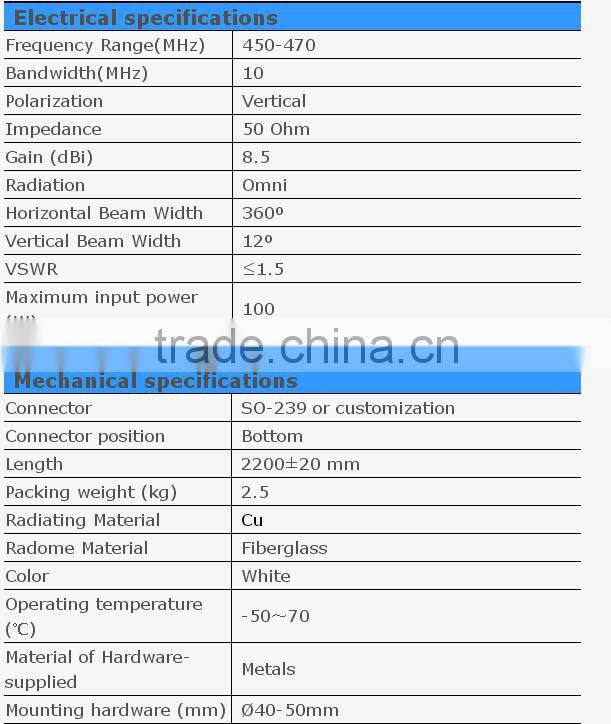 450-470MHz UHF High Gain 8.5dbi CDMA Outdoor Omni Directional Antenna With So-239 or Customized Connector