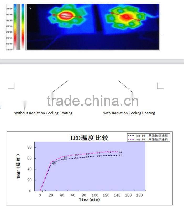 - 1. Radiation heat cooling coating is of high thermal conductivity and large cooling surface area. Meanwhile within a wide wavelength range (1-20μm), it has high emissivity, which can significantly improve the compound performances as conduction, convection and radiation cooling.