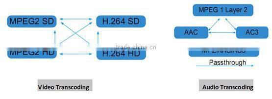 4* H.264 HD → 4*MPEG2/H.264 HD ; 4* H.264 HD → 4*MPEG2/H.264 SD ; 8* H.264 SD → 8 *MPEG2/H.264 SD | |||