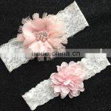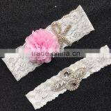 Pink Flower Elastic Lace Wedding Bride Garter,Butterfly Rhinestone Applique Wedding Garter Set