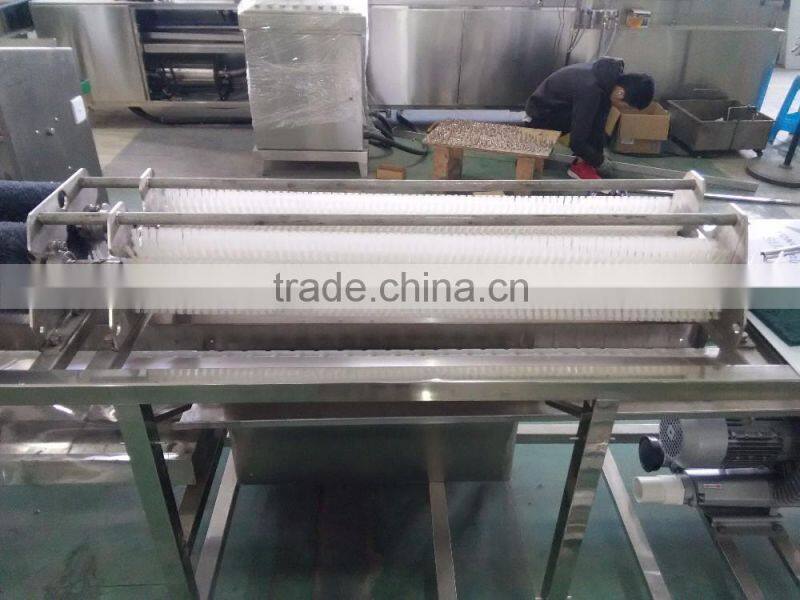 Eggs are put by vacuum egg lifter on the roller of cleaner, the shape of rollers have been specially designed, that make sure eggs align automatically, so as to guarantee all eggs enter the egg cleaning machine in good order.
